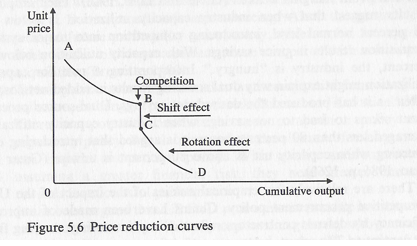 • Price reduction curve (figure 5.6) predicts lower prices with competition, influenced by a shift effect and a rotation effect.